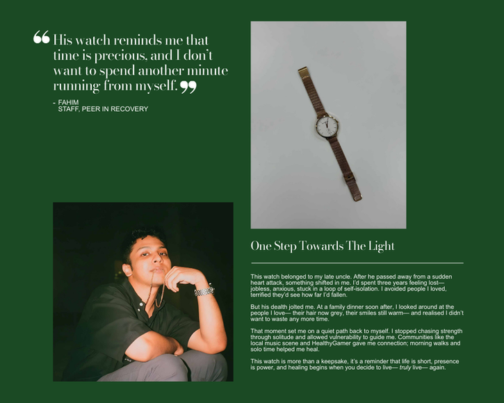 Each participant shared an object meaningful to their mental wellness journey, using it to tell their story of struggle, resilience, and hope.